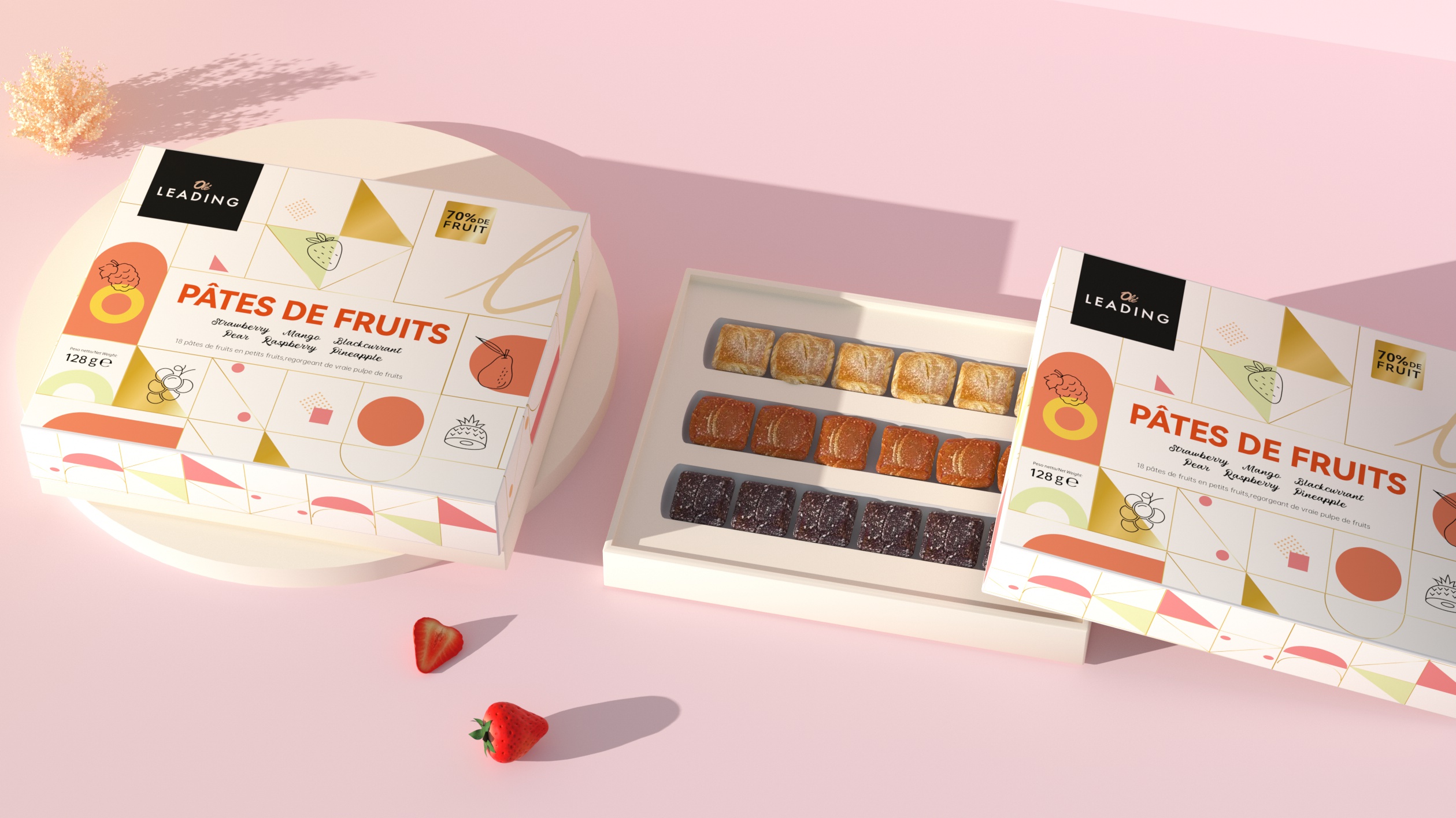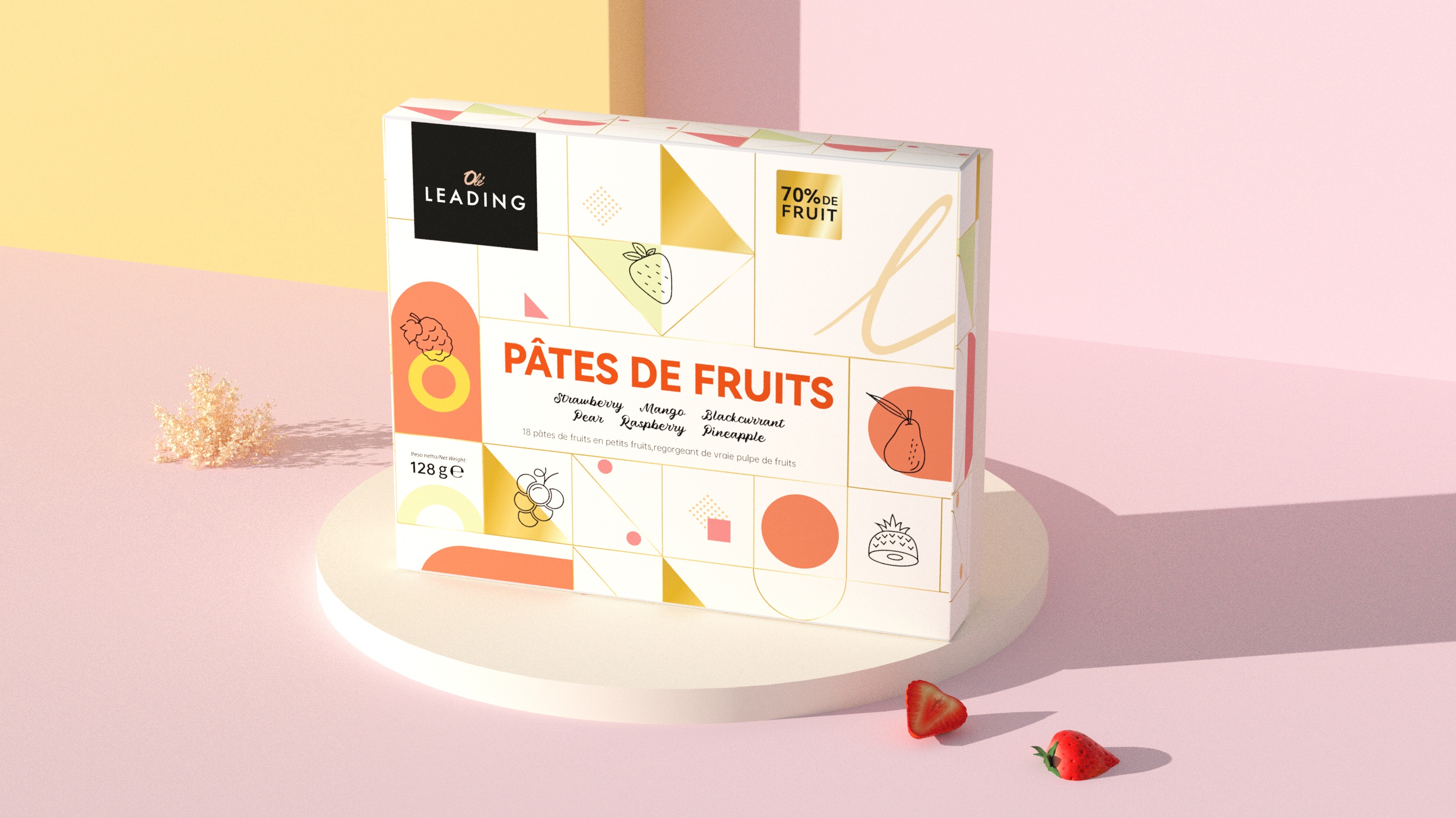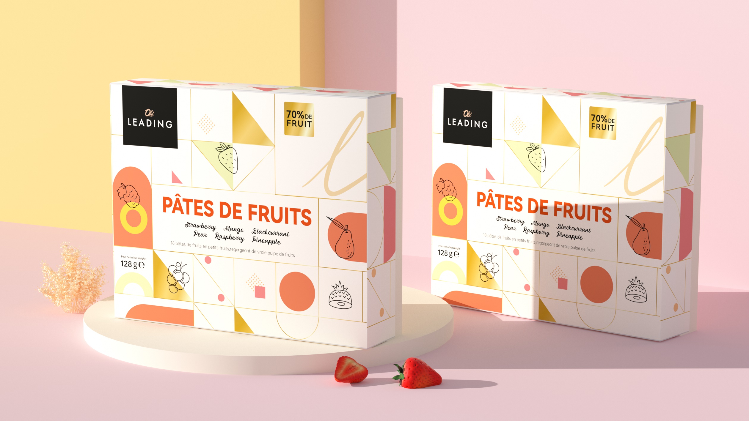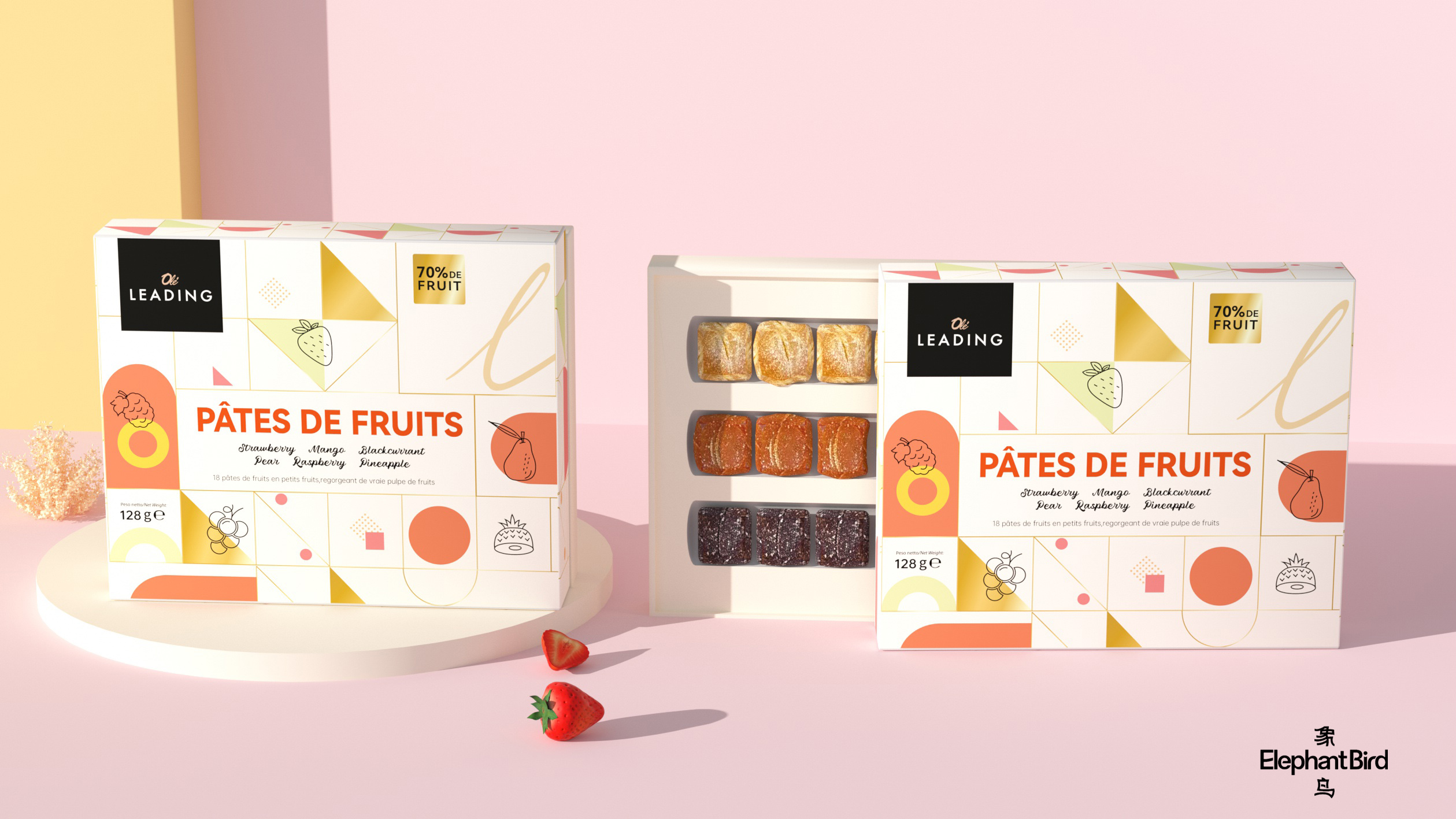 象鸟为 OLe 精品超市代购的 OLeLEADING 法式果汁软糖礼盒(混合口味)打造包装设计,该设计采用现代简约与几何拼接结合的轻复古法式风格,既保留了法式甜品包装的优雅质感,又融入当